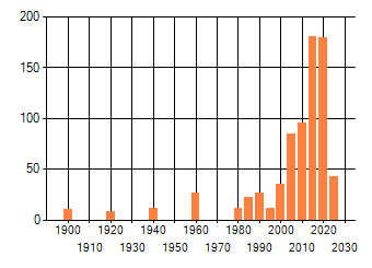 Het aantal atlasblokken (5x5 km) waarin de soort is gemeld binnen een periode van vijf jaar (vanaf 1980) of twintig jaar. Niet gecorrigeerd voor waarnemersinspanning en het aantal doorgegeven waarnemingen kan sterk variëren per periode, dus een trend in verspreiding kan hier niet direct uit worden afgelezen. Het opgegeven jaartal is het eerste jaar van de periode. Bron: gevalideerde waarnemingen uit de NDFF.