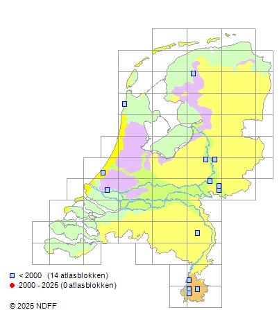 Zeer zeldzaam. Na 1980 is de soort slechts tweemaal waargenomen, nl. in Noord-Holland (1996) en Gelderland (1998).