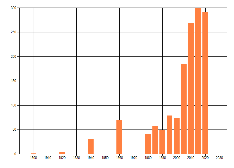 Het aantal atlasblokken (5x5 km) waarin de soort is gemeld binnen een periode van vijf jaar (vanaf 1980) of twintig jaar. Niet gecorrigeerd voor waarnemersinspanning en het aantal doorgegeven waarnemingen kan sterk variëren per periode, dus een trend in verspreiding kan hier niet direct uit worden afgelezen. Het opgegeven jaartal is het eerste jaar van de periode. Bron: gevalideerde waarnemingen uit de NDFF.