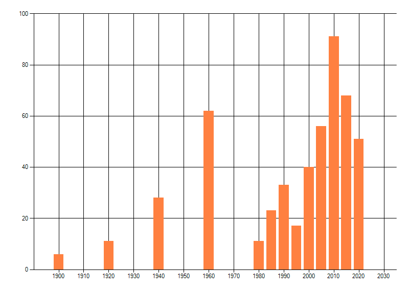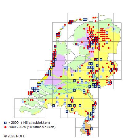 Het aantal atlasblokken (5x5 km) waarin de soort is gemeld binnen een periode van vijf jaar (vanaf 1980) of twintig jaar. Niet gecorrigeerd voor waarnemersinspanning en het aantal doorgegeven waarnemingen kan sterk variëren per periode, dus een trend in verspreiding kan hier niet direct uit worden afgelezen. Het opgegeven jaartal is het eerste jaar van de periode. Bron: gevalideerde waarnemingen uit de NDFF.