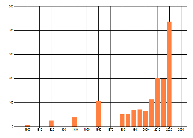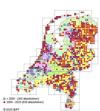 Het aantal atlasblokken (5x5 km) waarin de soort is gemeld binnen een periode van vijf jaar (vanaf 1980) of twintig jaar. Niet gecorrigeerd voor waarnemersinspanning en het aantal doorgegeven waarnemingen kan sterk variëren per periode, dus een trend in verspreiding kan hier niet direct uit worden afgelezen. Het opgegeven jaartal is het eerste jaar van de periode. Bron: gevalideerde waarnemingen uit de NDFF.