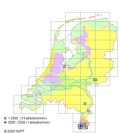 Het aantal atlasblokken (5x5 km) waarin de soort is gemeld binnen een periode van vijf jaar (vanaf 1980) of twintig jaar. Niet gecorrigeerd voor waarnemersinspanning en het aantal doorgegeven waarnemingen kan sterk variëren per periode, dus een trend in verspreiding kan hier niet direct uit worden afgelezen. Het opgegeven jaartal is het eerste jaar van de periode. Bron: gevalideerde waarnemingen uit de NDFF.
