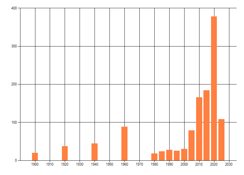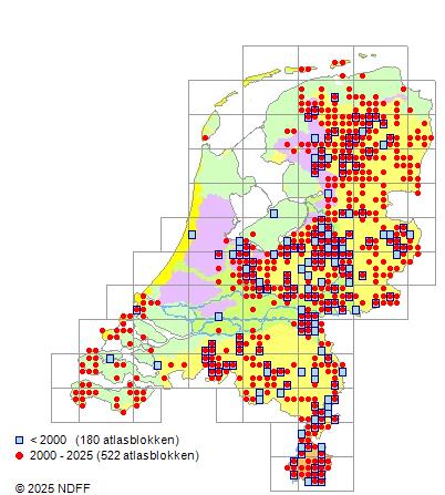 Het aantal atlasblokken (5x5 km) waarin de soort is gemeld binnen een periode van vijf jaar (vanaf 1980) of twintig jaar. Niet gecorrigeerd voor waarnemersinspanning en het aantal doorgegeven waarnemingen kan sterk variëren per periode, dus een trend in verspreiding kan hier niet direct uit worden afgelezen. Het opgegeven jaartal is het eerste jaar van de periode. Bron: gevalideerde waarnemingen uit de NDFF.