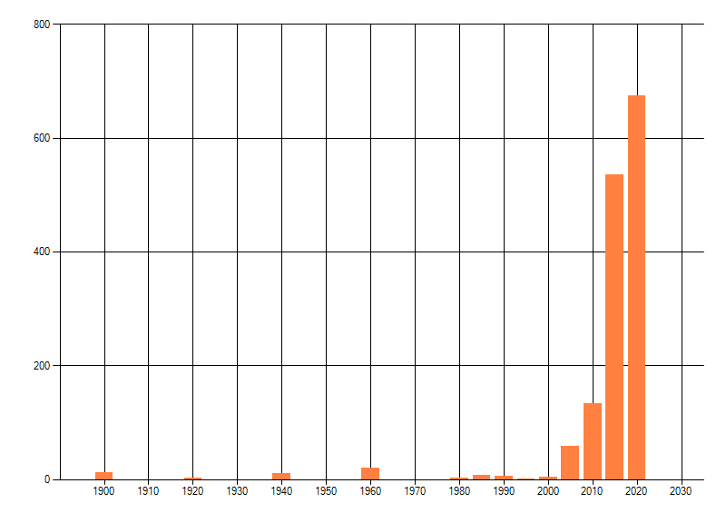 Het aantal atlasblokken (5x5 km) waarin de soort is gemeld binnen een periode van vijf jaar (vanaf 1980) of twintig jaar. Niet gecorrigeerd voor waarnemersinspanning en het aantal doorgegeven waarnemingen kan sterk variëren per periode, dus een trend in verspreiding kan hier niet direct uit worden afgelezen. Het opgegeven jaartal is het eerste jaar van de periode. Bron: gevalideerde waarnemingen uit de NDFF.