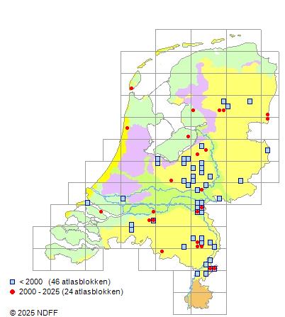 Het aantal atlasblokken (5x5 km) waarin de soort is gemeld binnen een periode van vijf jaar (vanaf 1980) of twintig jaar. Niet gecorrigeerd voor waarnemersinspanning en het aantal doorgegeven waarnemingen kan sterk variëren per periode, dus een trend in verspreiding kan hier niet direct uit worden afgelezen. Het opgegeven jaartal is het eerste jaar van de periode. Bron: gevalideerde waarnemingen uit de NDFF.