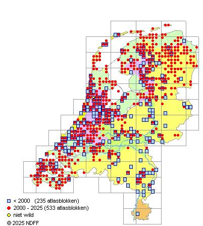 Het aantal atlasblokken (5x5 km) waarin de soort is gemeld binnen een periode van vijf jaar (vanaf 1980) of twintig jaar. Niet gecorrigeerd voor waarnemersinspanning en het aantal doorgegeven waarnemingen kan sterk variëren per periode, dus een trend in verspreiding kan hier niet direct uit worden afgelezen. Het opgegeven jaartal is het eerste jaar van de periode. Bron: gevalideerde waarnemingen uit de NDFF.