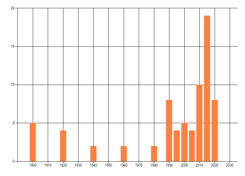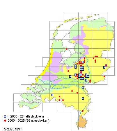 Het aantal atlasblokken (5x5 km) waarin de soort is gemeld binnen een periode van vijf jaar (vanaf 1980) of twintig jaar. Niet gecorrigeerd voor waarnemersinspanning en het aantal doorgegeven waarnemingen kan sterk variëren per periode, dus een trend in verspreiding kan hier niet direct uit worden afgelezen. Het opgegeven jaartal is het eerste jaar van de periode. Bron: gevalideerde waarnemingen uit de NDFF.