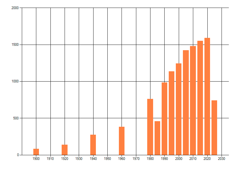 Het aantal atlasblokken (5x5 km) waarin de soort is gemeld binnen een periode van vijf jaar (vanaf 1980) of twintig jaar. Niet gecorrigeerd voor waarnemersinspanning en het aantal doorgegeven waarnemingen kan sterk variëren per periode, dus een trend in verspreiding kan hier niet direct uit worden afgelezen. Het opgegeven jaartal is het eerste jaar van de periode. Bron: gevalideerde waarnemingen uit de NDFF.
