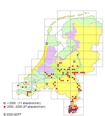 Zeldzaam. Komt vrijwel uitsluitend voor in Zuid- en Midden-Limburg. RL: gevoelig.