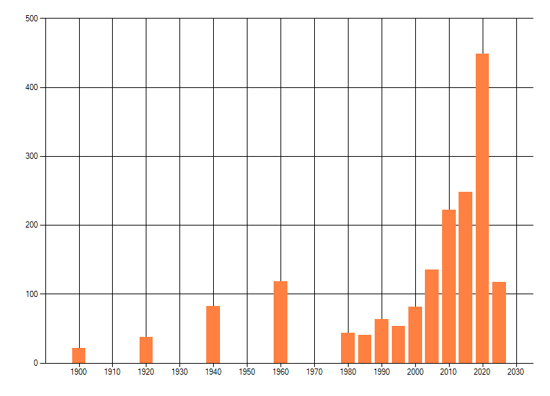 Het aantal atlasblokken (5x5 km) waarin de soort is gemeld binnen een periode van vijf jaar (vanaf 1980) of twintig jaar. Niet gecorrigeerd voor waarnemersinspanning en het aantal doorgegeven waarnemingen kan sterk variëren per periode, dus een trend in verspreiding kan hier niet direct uit worden afgelezen. Het opgegeven jaartal is het eerste jaar van de periode. Bron: gevalideerde waarnemingen uit de NDFF.