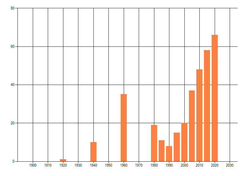 Het aantal atlasblokken (5x5 km) waarin de soort is gemeld binnen een periode van vijf jaar (vanaf 1980) of twintig jaar. Niet gecorrigeerd voor waarnemersinspanning en het aantal doorgegeven waarnemingen kan sterk variëren per periode, dus een trend in verspreiding kan hier niet direct uit worden afgelezen. Het opgegeven jaartal is het eerste jaar van de periode. Bron: gevalideerde waarnemingen uit de NDFF.