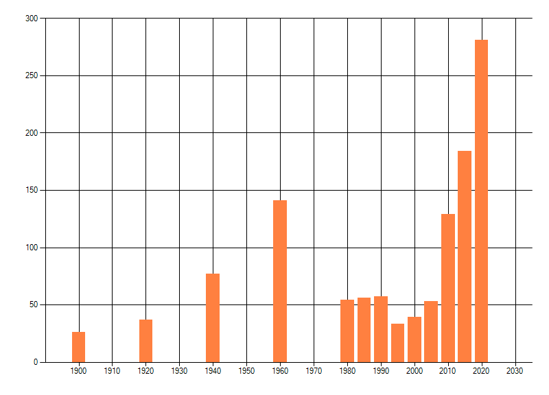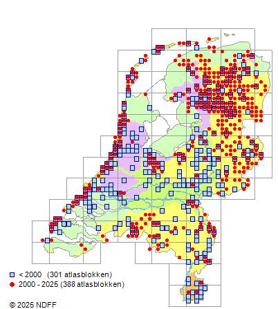 Het aantal atlasblokken (5x5 km) waarin de soort is gemeld binnen een periode van vijf jaar (vanaf 1980) of twintig jaar. Niet gecorrigeerd voor waarnemersinspanning en het aantal doorgegeven waarnemingen kan sterk variëren per periode, dus een trend in verspreiding kan hier niet direct uit worden afgelezen. Het opgegeven jaartal is het eerste jaar van de periode. Bron: gevalideerde waarnemingen uit de NDFF.