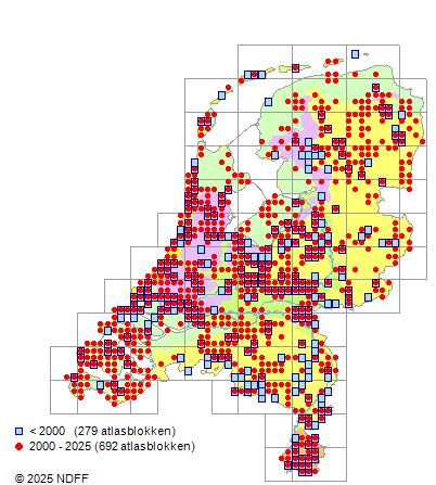 Het aantal atlasblokken (5x5 km) waarin de soort is gemeld binnen een periode van vijf jaar (vanaf 1980) of twintig jaar. Niet gecorrigeerd voor waarnemersinspanning en het aantal doorgegeven waarnemingen kan sterk variëren per periode, dus een trend in verspreiding kan hier niet direct uit worden afgelezen. Het opgegeven jaartal is het eerste jaar van de periode. Bron: gevalideerde waarnemingen uit de NDFF.