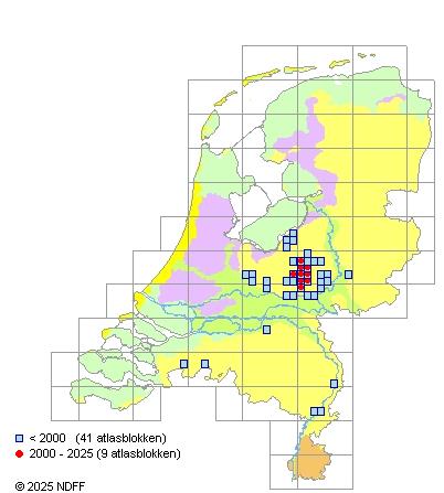 Het aantal atlasblokken (5x5 km) waarin de soort is gemeld binnen een periode van vijf jaar (vanaf 1980) of twintig jaar. Niet gecorrigeerd voor waarnemersinspanning en het aantal doorgegeven waarnemingen kan sterk variëren per periode, dus een trend in verspreiding kan hier niet direct uit worden afgelezen. Het opgegeven jaartal is het eerste jaar van de periode. Bron: gevalideerde waarnemingen uit de NDFF.