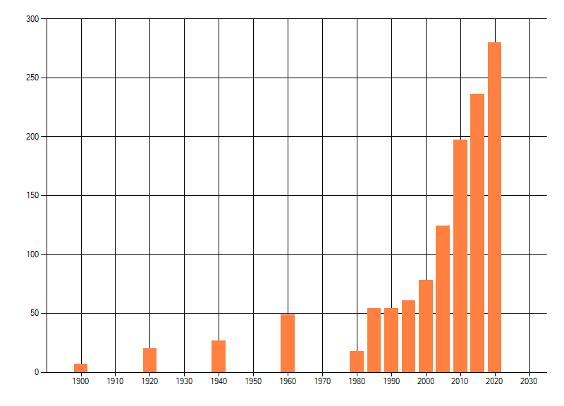 Het aantal atlasblokken (5x5 km) waarin de soort is gemeld binnen een periode van vijf jaar (vanaf 1980) of twintig jaar. Niet gecorrigeerd voor waarnemersinspanning en het aantal doorgegeven waarnemingen kan sterk variëren per periode, dus een trend in verspreiding kan hier niet direct uit worden afgelezen. Het opgegeven jaartal is het eerste jaar van de periode. Bron: gevalideerde waarnemingen uit de NDFF.