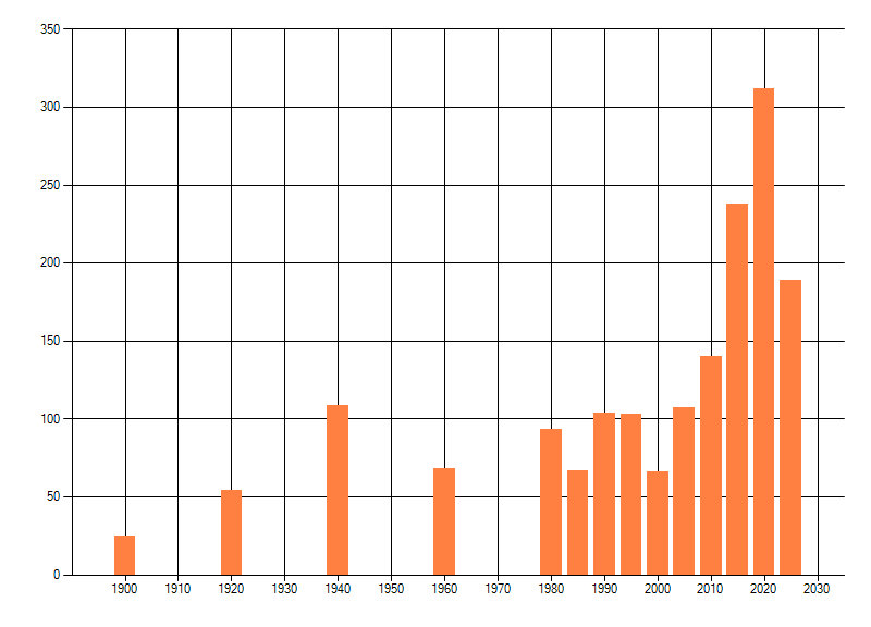 Het aantal atlasblokken (5x5 km) waarin de soort is gemeld binnen een periode van vijf jaar (vanaf 1980) of twintig jaar. Niet gecorrigeerd voor waarnemersinspanning en het aantal doorgegeven waarnemingen kan sterk variëren per periode, dus een trend in verspreiding kan hier niet direct uit worden afgelezen. Het opgegeven jaartal is het eerste jaar van de periode. Bron: gevalideerde waarnemingen uit de NDFF.