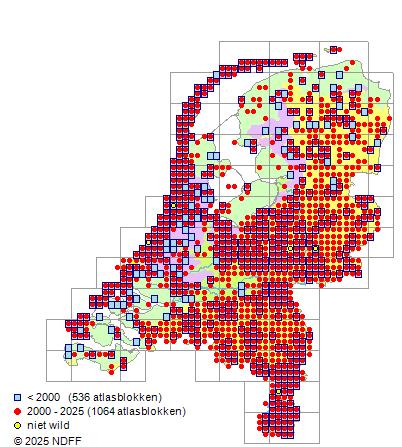 Het aantal atlasblokken (5x5 km) waarin de soort is gemeld binnen een periode van vijf jaar (vanaf 1980) of twintig jaar. Niet gecorrigeerd voor waarnemersinspanning en het aantal doorgegeven waarnemingen kan sterk variëren per periode, dus een trend in verspreiding kan hier niet direct uit worden afgelezen. Het opgegeven jaartal is het eerste jaar van de periode. Bron: gevalideerde waarnemingen uit de NDFF.