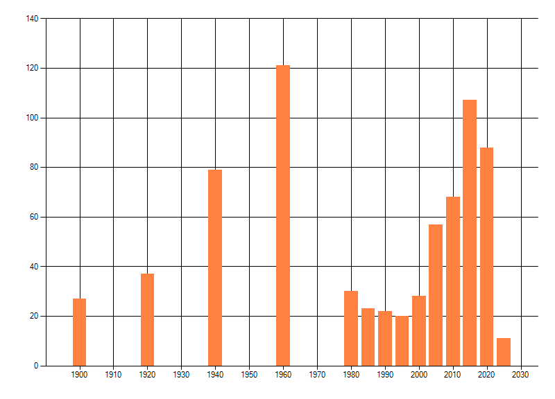 Het aantal atlasblokken (5x5 km) waarin de soort is gemeld binnen een periode van vijf jaar (vanaf 1980) of twintig jaar. Niet gecorrigeerd voor waarnemersinspanning en het aantal doorgegeven waarnemingen kan sterk variëren per periode, dus een trend in verspreiding kan hier niet direct uit worden afgelezen. Het opgegeven jaartal is het eerste jaar van de periode. Bron: gevalideerde waarnemingen uit de NDFF.