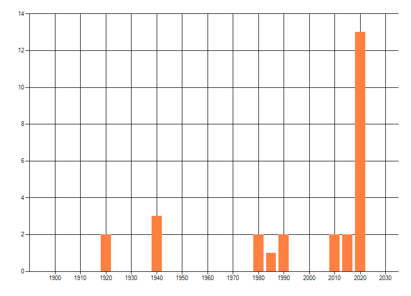 Het aantal atlasblokken (5x5 km) waarin de soort is gemeld binnen een periode van vijf jaar (vanaf 1980) of twintig jaar. Niet gecorrigeerd voor waarnemersinspanning en het aantal doorgegeven waarnemingen kan sterk variëren per periode, dus een trend in verspreiding kan hier niet direct uit worden afgelezen. Het opgegeven jaartal is het eerste jaar van de periode. Bron: gevalideerde waarnemingen uit de NDFF.