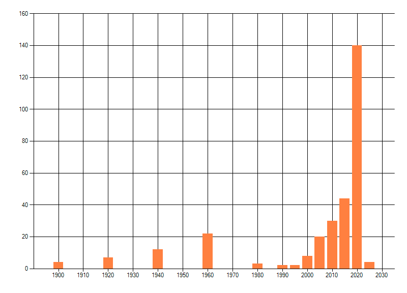 Het aantal atlasblokken (5x5 km) waarin de soort is gemeld binnen een periode van vijf jaar (vanaf 1980) of twintig jaar. Niet gecorrigeerd voor waarnemersinspanning en het aantal doorgegeven waarnemingen kan sterk variëren per periode, dus een trend in verspreiding kan hier niet direct uit worden afgelezen. Het opgegeven jaartal is het eerste jaar van de periode. Bron: gevalideerde waarnemingen uit de NDFF.