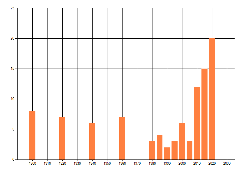 Het aantal atlasblokken (5x5 km) waarin de soort is gemeld binnen een periode van vijf jaar (vanaf 1980) of twintig jaar. Niet gecorrigeerd voor waarnemersinspanning en het aantal doorgegeven waarnemingen kan sterk variëren per periode, dus een trend in verspreiding kan hier niet direct uit worden afgelezen. Het opgegeven jaartal is het eerste jaar van de periode. Bron: gevalideerde waarnemingen uit de NDFF.