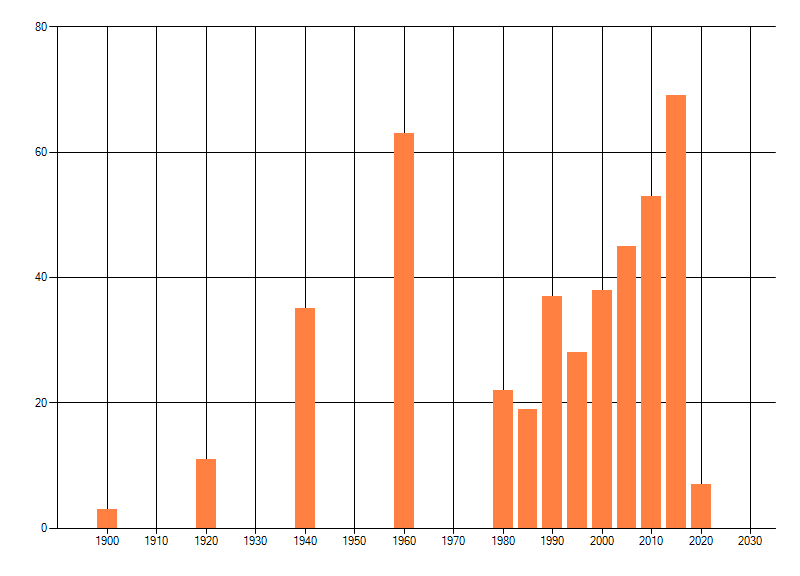 Het aantal atlasblokken (5x5 km) waarin de soort is gemeld binnen een periode van vijf jaar (vanaf 1980) of twintig jaar. Niet gecorrigeerd voor waarnemersinspanning en het aantal doorgegeven waarnemingen kan sterk variëren per periode, dus een trend in verspreiding kan hier niet direct uit worden afgelezen. Het opgegeven jaartal is het eerste jaar van de periode. Bron: gevalideerde waarnemingen uit de NDFF.