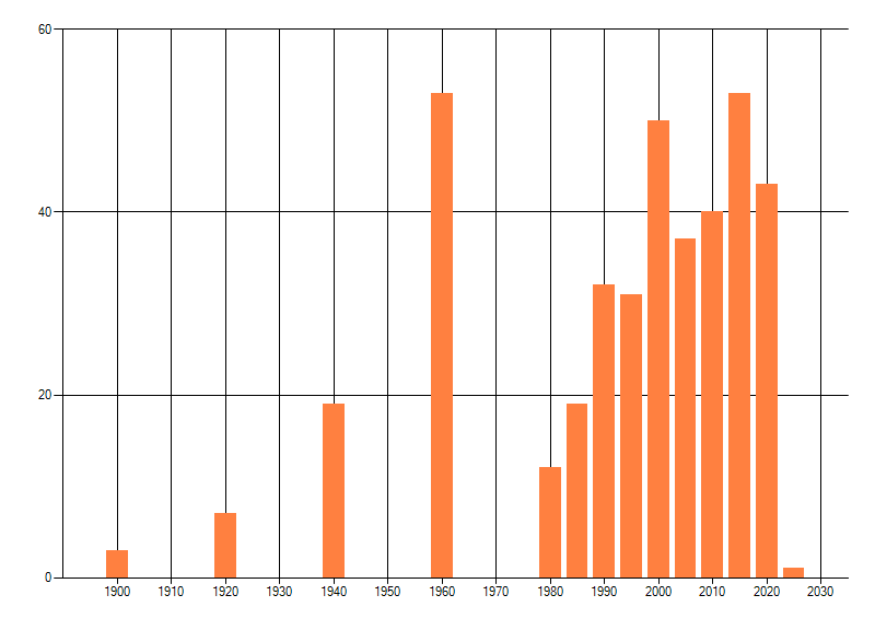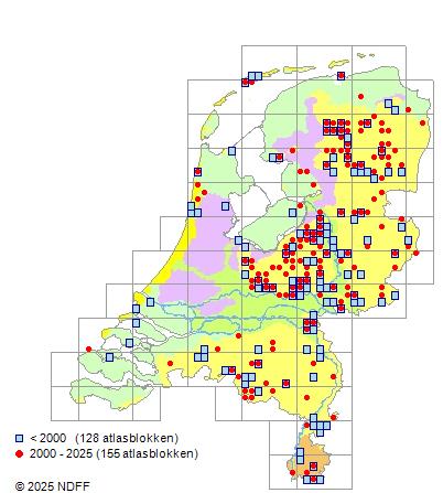 Het aantal atlasblokken (5x5 km) waarin de soort is gemeld binnen een periode van vijf jaar (vanaf 1980) of twintig jaar. Niet gecorrigeerd voor waarnemersinspanning en het aantal doorgegeven waarnemingen kan sterk variëren per periode, dus een trend in verspreiding kan hier niet direct uit worden afgelezen. Het opgegeven jaartal is het eerste jaar van de periode. Bron: gevalideerde waarnemingen uit de NDFF.
