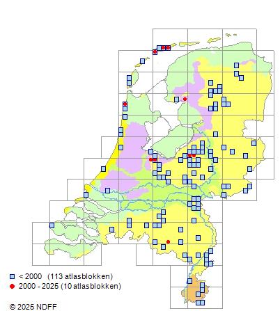 Het aantal atlasblokken (5x5 km) waarin de soort is gemeld binnen een periode van vijf jaar (vanaf 1980) of twintig jaar. Niet gecorrigeerd voor waarnemersinspanning en het aantal doorgegeven waarnemingen kan sterk variëren per periode, dus een trend in verspreiding kan hier niet direct uit worden afgelezen. Het opgegeven jaartal is het eerste jaar van de periode. Bron: gevalideerde waarnemingen uit de NDFF.