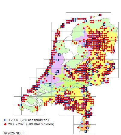 Het aantal atlasblokken (5x5 km) waarin de soort is gemeld binnen een periode van vijf jaar (vanaf 1980) of twintig jaar. Niet gecorrigeerd voor waarnemersinspanning en het aantal doorgegeven waarnemingen kan sterk variëren per periode, dus een trend in verspreiding kan hier niet direct uit worden afgelezen. Het opgegeven jaartal is het eerste jaar van de periode. Bron: gevalideerde waarnemingen uit de NDFF.