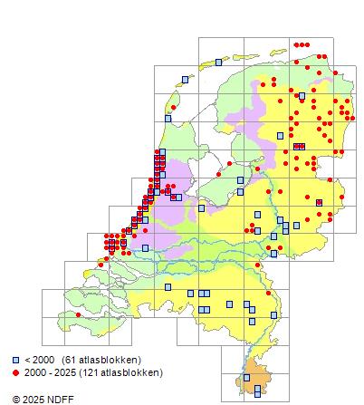 Het aantal atlasblokken (5x5 km) waarin de soort is gemeld binnen een periode van vijf jaar (vanaf 1980) of twintig jaar. Niet gecorrigeerd voor waarnemersinspanning en het aantal doorgegeven waarnemingen kan sterk variëren per periode, dus een trend in verspreiding kan hier niet direct uit worden afgelezen. Het opgegeven jaartal is het eerste jaar van de periode. Bron: gevalideerde waarnemingen uit de NDFF.