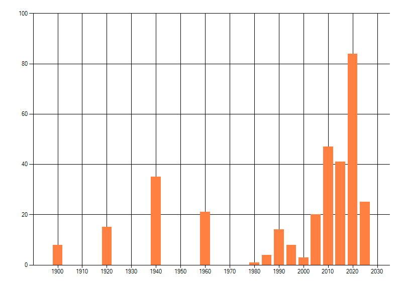 Het aantal atlasblokken (5x5 km) waarin de soort is gemeld binnen een periode van vijf jaar (vanaf 1980) of twintig jaar. Niet gecorrigeerd voor waarnemersinspanning en het aantal doorgegeven waarnemingen kan sterk variëren per periode, dus een trend in verspreiding kan hier niet direct uit worden afgelezen. Het opgegeven jaartal is het eerste jaar van de periode. Bron: gevalideerde waarnemingen uit de NDFF.