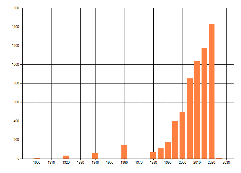 Het aantal atlasblokken (5x5 km) waarin de soort is gemeld binnen een periode van vijf jaar (vanaf 1980) of twintig jaar. Niet gecorrigeerd voor waarnemersinspanning en het aantal doorgegeven waarnemingen kan sterk variëren per periode, dus een trend in verspreiding kan hier niet direct uit worden afgelezen. Het opgegeven jaartal is het eerste jaar van de periode. Bron: gevalideerde waarnemingen uit de NDFF.