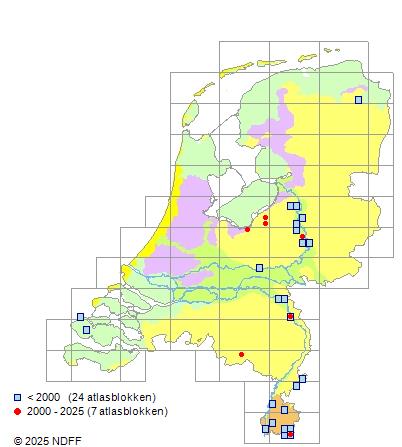 Zeer zeldzaam. Wordt verspreid over het land slechts af en toe waargenomen. RL: ernstig bedreigd.