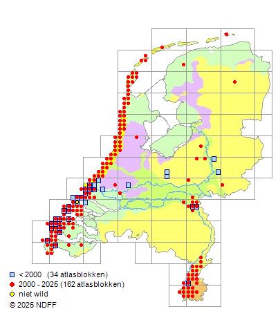 Het aantal atlasblokken (5x5 km) waarin de soort is gemeld binnen een periode van vijf jaar (vanaf 1980) of twintig jaar. Niet gecorrigeerd voor waarnemersinspanning en het aantal doorgegeven waarnemingen kan sterk variëren per periode, dus een trend in verspreiding kan hier niet direct uit worden afgelezen. Het opgegeven jaartal is het eerste jaar van de periode. Bron: gevalideerde waarnemingen uit de NDFF.