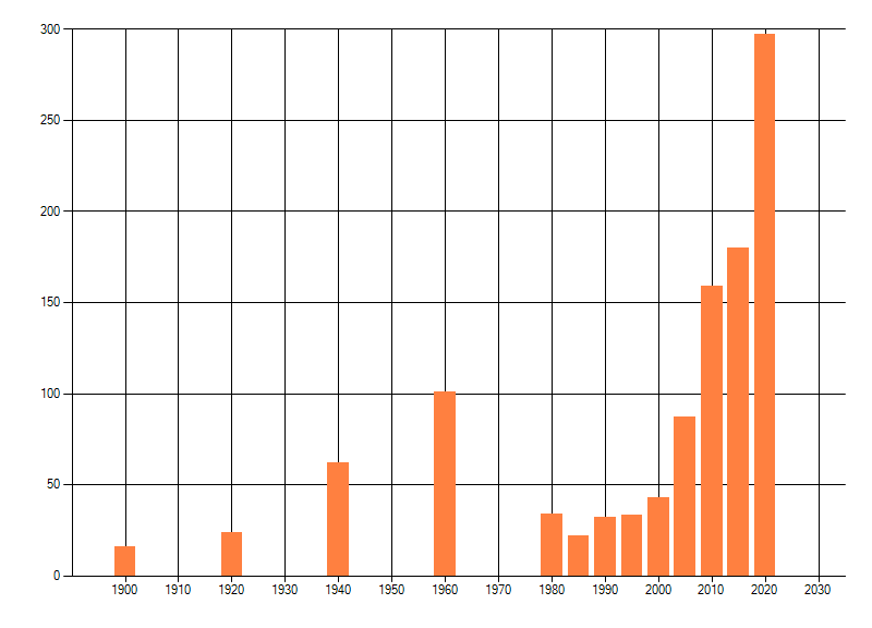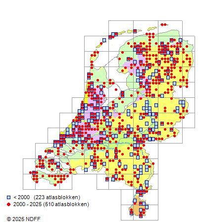 Het aantal atlasblokken (5x5 km) waarin de soort is gemeld binnen een periode van vijf jaar (vanaf 1980) of twintig jaar. Niet gecorrigeerd voor waarnemersinspanning en het aantal doorgegeven waarnemingen kan sterk variëren per periode, dus een trend in verspreiding kan hier niet direct uit worden afgelezen. Het opgegeven jaartal is het eerste jaar van de periode. Bron: gevalideerde waarnemingen uit de NDFF.