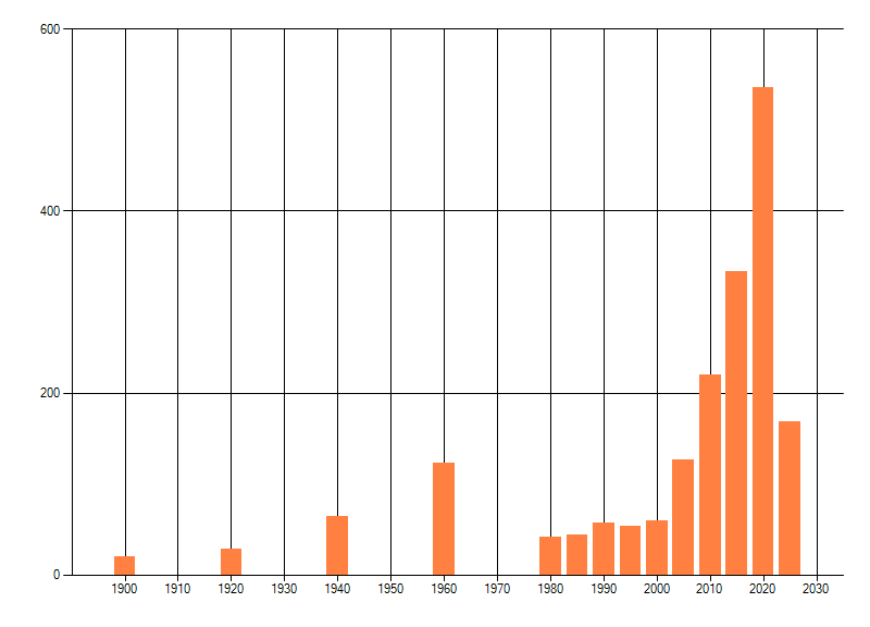Het aantal atlasblokken (5x5 km) waarin de soort is gemeld binnen een periode van vijf jaar (vanaf 1980) of twintig jaar. Niet gecorrigeerd voor waarnemersinspanning en het aantal doorgegeven waarnemingen kan sterk variëren per periode, dus een trend in verspreiding kan hier niet direct uit worden afgelezen. Het opgegeven jaartal is het eerste jaar van de periode. Bron: gevalideerde waarnemingen uit de NDFF.