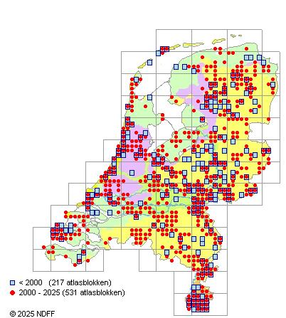 Het aantal atlasblokken (5x5 km) waarin de soort is gemeld binnen een periode van vijf jaar (vanaf 1980) of twintig jaar. Niet gecorrigeerd voor waarnemersinspanning en het aantal doorgegeven waarnemingen kan sterk variëren per periode, dus een trend in verspreiding kan hier niet direct uit worden afgelezen. Het opgegeven jaartal is het eerste jaar van de periode. Bron: gevalideerde waarnemingen uit de NDFF.