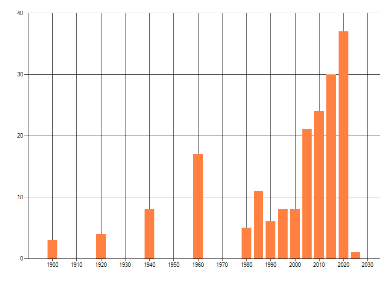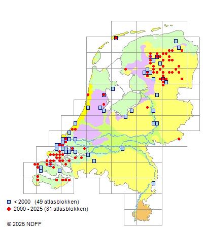 Het aantal atlasblokken (5x5 km) waarin de soort is gemeld binnen een periode van vijf jaar (vanaf 1980) of twintig jaar. Niet gecorrigeerd voor waarnemersinspanning en het aantal doorgegeven waarnemingen kan sterk variëren per periode, dus een trend in verspreiding kan hier niet direct uit worden afgelezen. Het opgegeven jaartal is het eerste jaar van de periode. Bron: gevalideerde waarnemingen uit de NDFF.