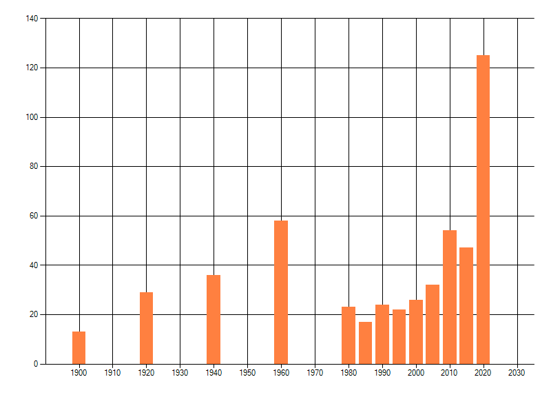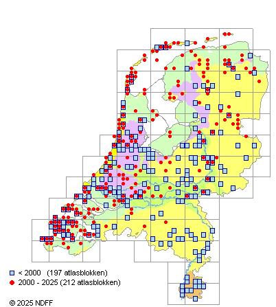 Het aantal atlasblokken (5x5 km) waarin de soort is gemeld binnen een periode van vijf jaar (vanaf 1980) of twintig jaar. Niet gecorrigeerd voor waarnemersinspanning en het aantal doorgegeven waarnemingen kan sterk variëren per periode, dus een trend in verspreiding kan hier niet direct uit worden afgelezen. Het opgegeven jaartal is het eerste jaar van de periode. Bron: gevalideerde waarnemingen uit de NDFF.