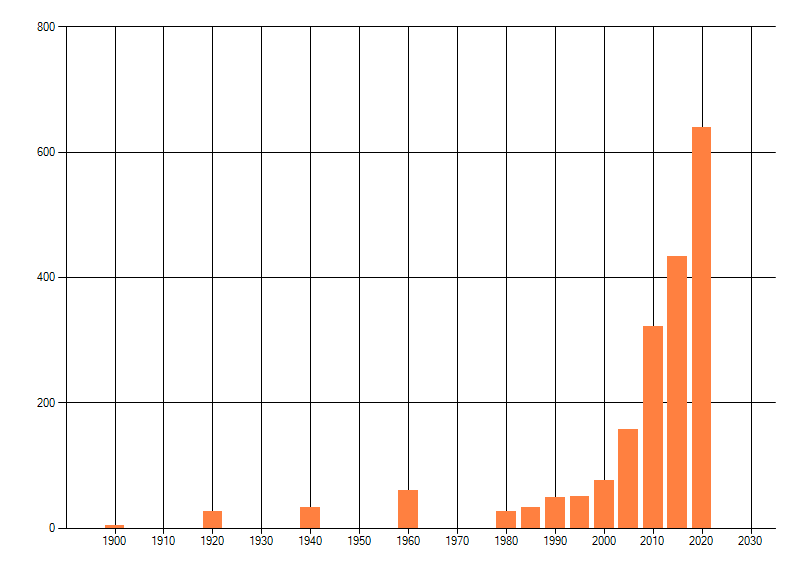 Het aantal atlasblokken (5x5 km) waarin de soort is gemeld binnen een periode van vijf jaar (vanaf 1980) of twintig jaar. Niet gecorrigeerd voor waarnemersinspanning en het aantal doorgegeven waarnemingen kan sterk variëren per periode, dus een trend in verspreiding kan hier niet direct uit worden afgelezen. Het opgegeven jaartal is het eerste jaar van de periode. Bron: gevalideerde waarnemingen uit de NDFF.