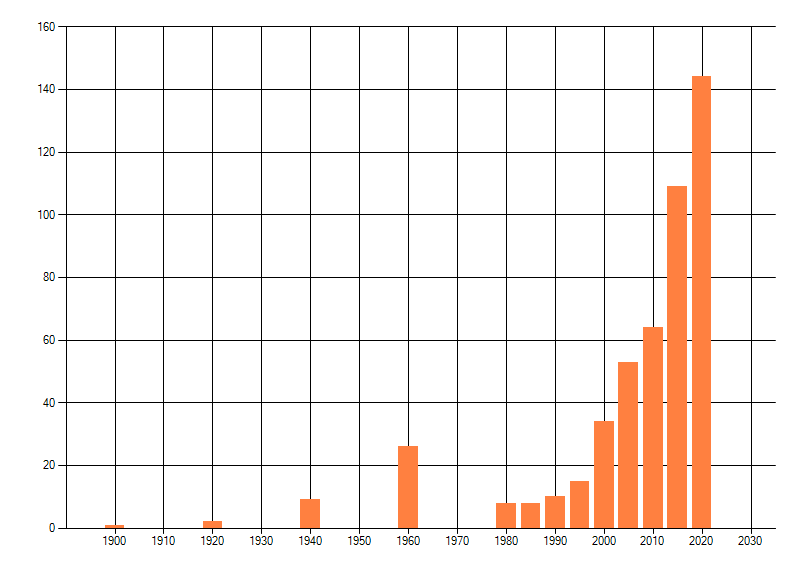 Het aantal atlasblokken (5x5 km) waarin de soort is gemeld binnen een periode van vijf jaar (vanaf 1980) of twintig jaar. Niet gecorrigeerd voor waarnemersinspanning en het aantal doorgegeven waarnemingen kan sterk variëren per periode, dus een trend in verspreiding kan hier niet direct uit worden afgelezen. Het opgegeven jaartal is het eerste jaar van de periode. Bron: gevalideerde waarnemingen uit de NDFF.