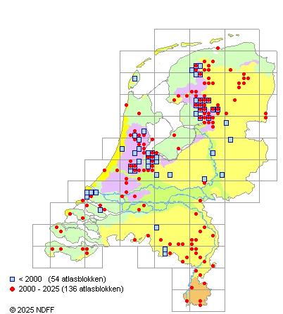 Het aantal atlasblokken (5x5 km) waarin de soort is gemeld binnen een periode van vijf jaar (vanaf 1980) of twintig jaar. Niet gecorrigeerd voor waarnemersinspanning en het aantal doorgegeven waarnemingen kan sterk variëren per periode, dus een trend in verspreiding kan hier niet direct uit worden afgelezen. Het opgegeven jaartal is het eerste jaar van de periode. Bron: gevalideerde waarnemingen uit de NDFF.