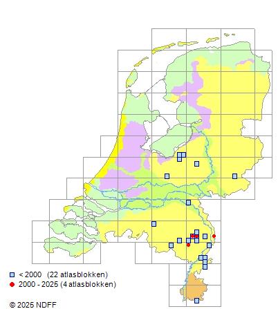 Het aantal atlasblokken (5x5 km) waarin de soort is gemeld binnen een periode van vijf jaar (vanaf 1980) of twintig jaar. Niet gecorrigeerd voor waarnemersinspanning en het aantal doorgegeven waarnemingen kan sterk variëren per periode, dus een trend in verspreiding kan hier niet direct uit worden afgelezen. Het opgegeven jaartal is het eerste jaar van de periode. Bron: gevalideerde waarnemingen uit de NDFF.