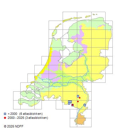 Het aantal atlasblokken (5x5 km) waarin de soort is gemeld binnen een periode van vijf jaar (vanaf 1980) of twintig jaar. Niet gecorrigeerd voor waarnemersinspanning en het aantal doorgegeven waarnemingen kan sterk variëren per periode, dus een trend in verspreiding kan hier niet direct uit worden afgelezen. Het opgegeven jaartal is het eerste jaar van de periode. Bron: gevalideerde waarnemingen uit de NDFF.
