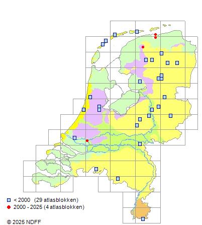 Het aantal atlasblokken (5x5 km) waarin de soort is gemeld binnen een periode van vijf jaar (vanaf 1980) of twintig jaar. Niet gecorrigeerd voor waarnemersinspanning en het aantal doorgegeven waarnemingen kan sterk variëren per periode, dus een trend in verspreiding kan hier niet direct uit worden afgelezen. Het opgegeven jaartal is het eerste jaar van de periode. Bron: gevalideerde waarnemingen uit de NDFF.
