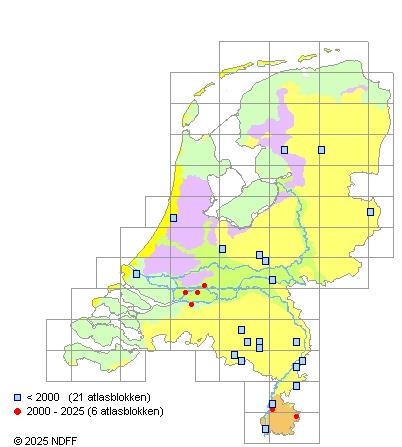 Het aantal atlasblokken (5x5 km) waarin de soort is gemeld binnen een periode van vijf jaar (vanaf 1980) of twintig jaar. Niet gecorrigeerd voor waarnemersinspanning en het aantal doorgegeven waarnemingen kan sterk variëren per periode, dus een trend in verspreiding kan hier niet direct uit worden afgelezen. Het opgegeven jaartal is het eerste jaar van de periode. Bron: gevalideerde waarnemingen uit de NDFF.