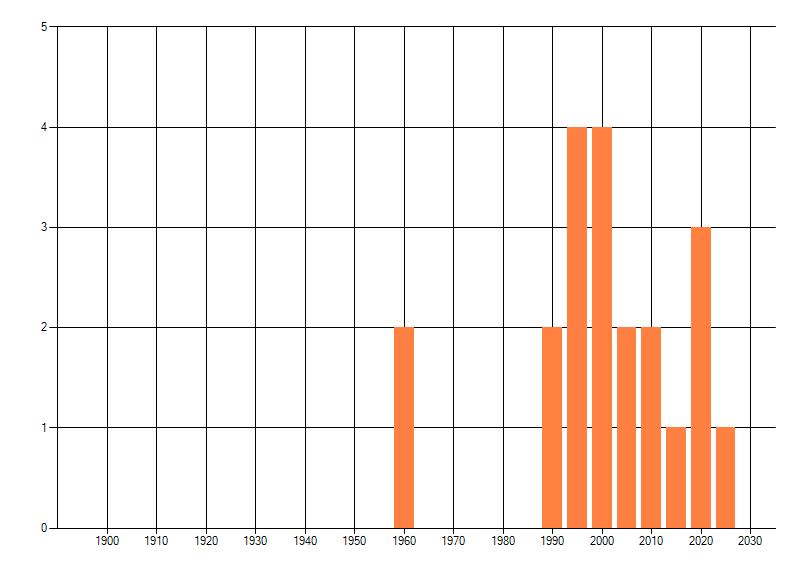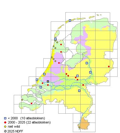 Het aantal atlasblokken (5x5 km) waarin de soort is gemeld binnen een periode van vijf jaar (vanaf 1980) of twintig jaar. Niet gecorrigeerd voor waarnemersinspanning en het aantal doorgegeven waarnemingen kan sterk variëren per periode, dus een trend in verspreiding kan hier niet direct uit worden afgelezen. Het opgegeven jaartal is het eerste jaar van de periode. Bron: gevalideerde waarnemingen uit de NDFF.
