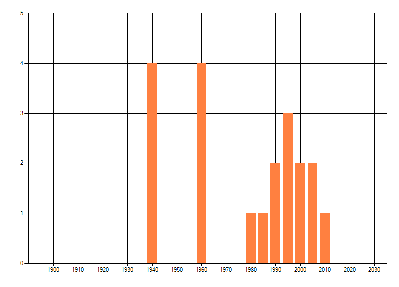 Het aantal atlasblokken (5x5 km) waarin de soort is gemeld binnen een periode van vijf jaar (vanaf 1980) of twintig jaar. Niet gecorrigeerd voor waarnemersinspanning en het aantal doorgegeven waarnemingen kan sterk variëren per periode, dus een trend in verspreiding kan hier niet direct uit worden afgelezen. Het opgegeven jaartal is het eerste jaar van de periode. Bron: gevalideerde waarnemingen uit de NDFF.