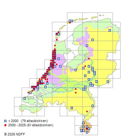 Het aantal atlasblokken (5x5 km) waarin de soort is gemeld binnen een periode van vijf jaar (vanaf 1980) of twintig jaar. Niet gecorrigeerd voor waarnemersinspanning en het aantal doorgegeven waarnemingen kan sterk variëren per periode, dus een trend in verspreiding kan hier niet direct uit worden afgelezen. Het opgegeven jaartal is het eerste jaar van de periode. Bron: gevalideerde waarnemingen uit de NDFF.