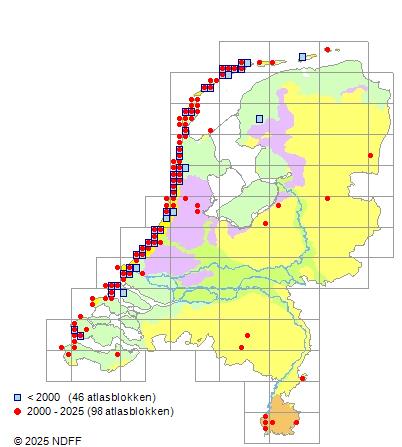 Vrij zeldzaam. Een soort die vrijwel uitsluitend langs de kust in de duinen wordt gezien; waarnemingen uit het binnenland zijn zeldzaam. RL: kwetsbaar.